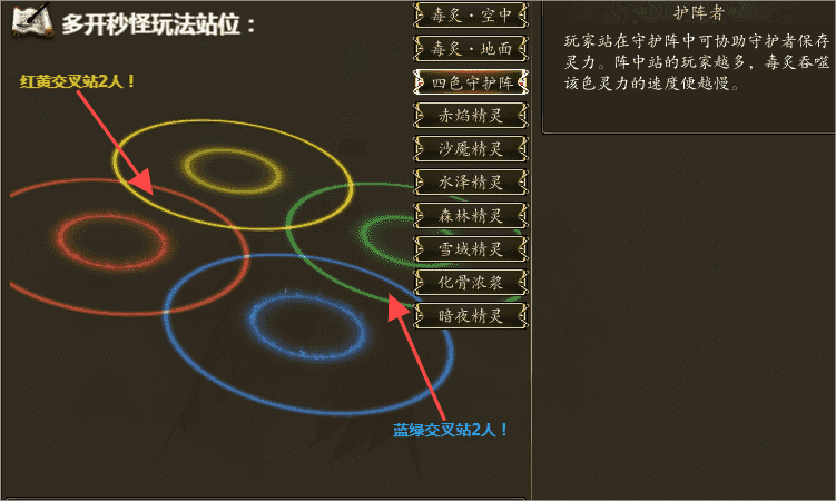②同时四色守护阵开启,正常每个区域站2名玩家拉对应颜色精灵圈内击杀让守护者获得能量、其中雪域精灵击杀后灵力可被任何守护者吸收;