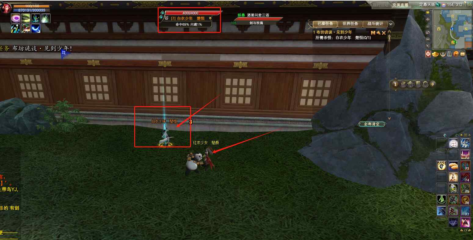 得到新的线索后,返回布坊(165.350),守株待兔等待白衣少年。翌日,鬼鬼祟祟的白衣少年出现后离开,我们紧随其后,到(157.430)自动接到下一段任务,一直往前(北方),在(154.313)找到白衣少年,并发现他有同伙,上前对话白衣少年 楚恒(154.312),出现一个白衣少年的BB,4000血,轻松杀掉,在对话红衣少女 楚颜 (154.312),出现红衣少女BB,也是4000血,一起杀掉!