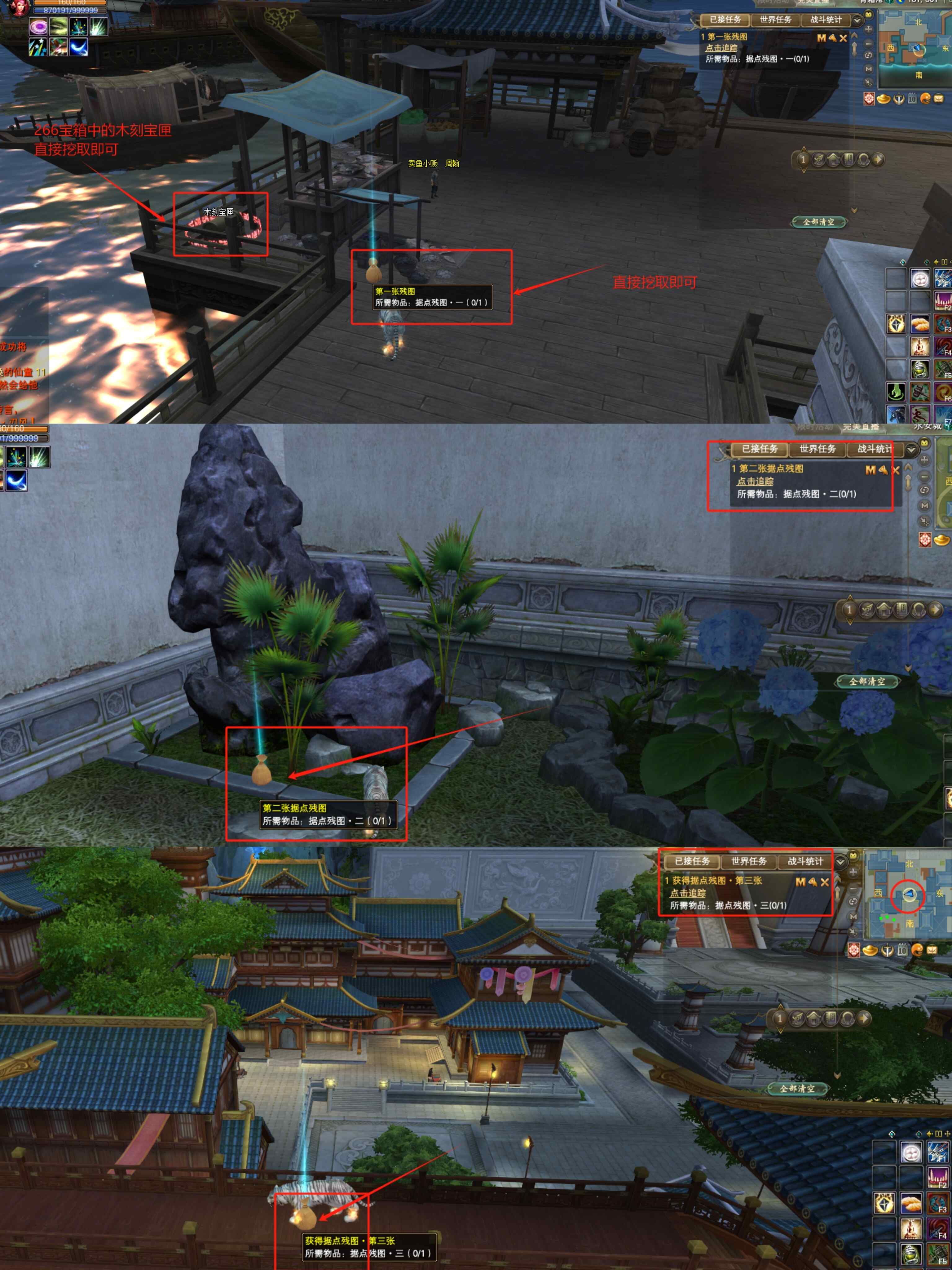 继续和说书人 明岳对话,接到任务,前往定鼎天灯,根据追踪黄圈提示,到达(184.339.高度59),未发现残图,弹出剧情提示,接到任务:据点残图三,往西北方向飞,到达(157.365.高度62),挖取小包裹,挖取后自动传送回说书人 明岳所在地。