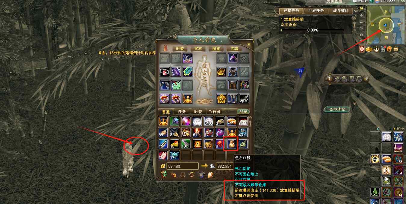 和李婶(185.308)对话结束后,获得成就:意外的礼物,奖励5个天行宫馈印。屏幕变灰暗后,再次和李婶对话,接到任务:放置捕捞袋,抓萤火虫!根据追踪黄圈和捕捞袋提示的坐标,我们前往悦来客栈背后(141.336),右键点击背包里的粗布口袋,放置捕捞袋,放置好以后,周围会出现萤火虫,用群攻技能攻击萤火虫,再把萤火虫带到捕捞袋附近,萤火虫就被抓进去口袋里面了。(一个点萤火虫是4只,群3个点的萤火虫拉过去,就能完成任务了)