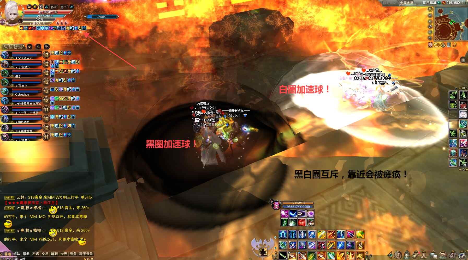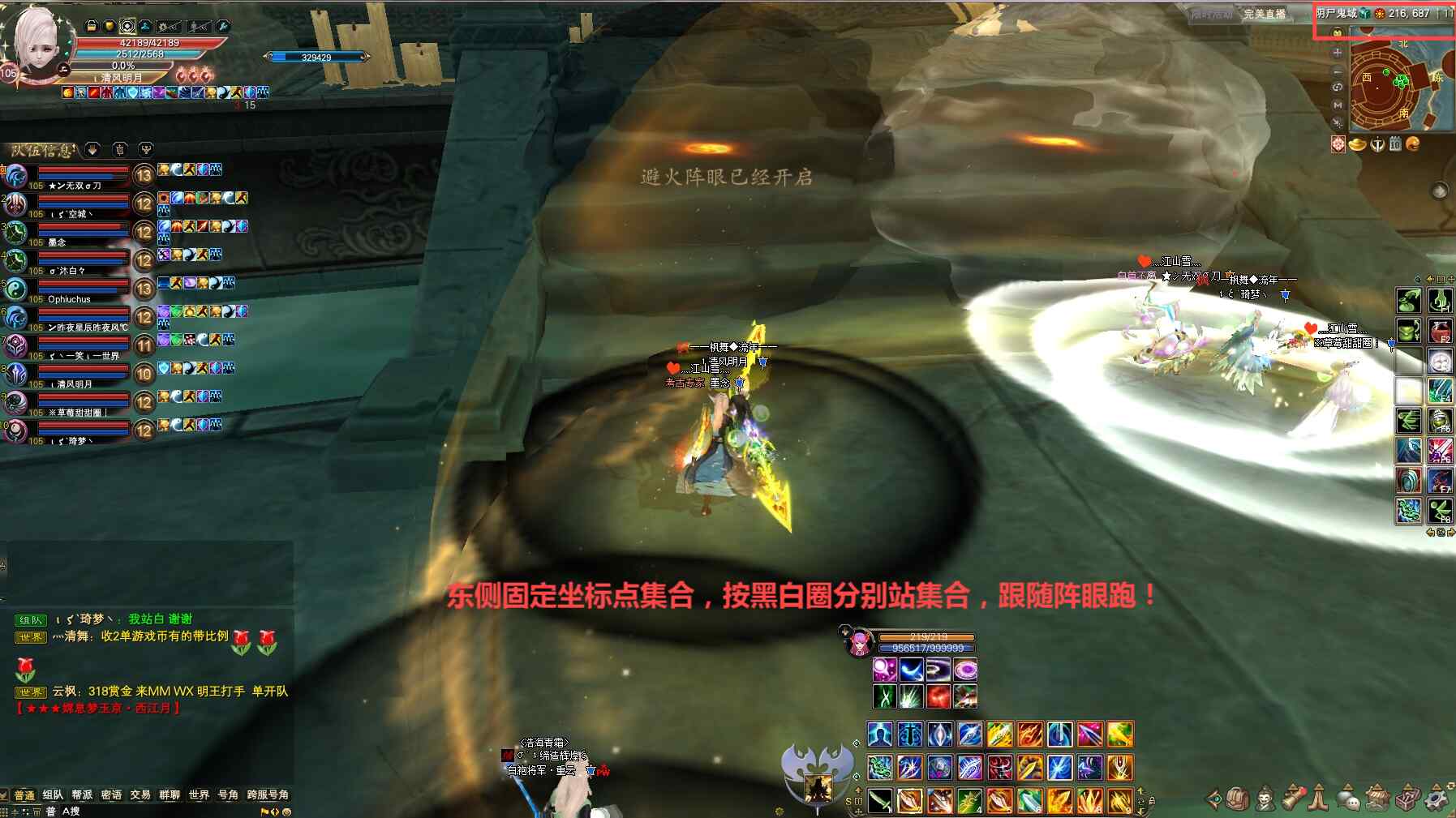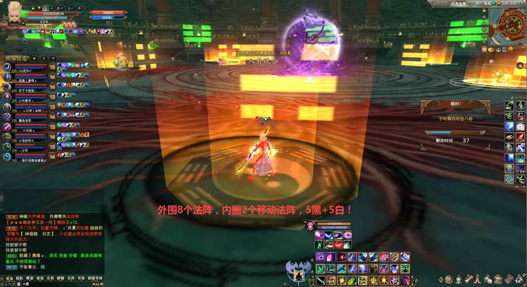 ⑸外圈8个法阵、内圈两个移动已激活法阵,提示八卦即合后是5个黑圈+5个白圈,需去东边固定坐标的避火阵眼按黑白圈分别站集合。(注意黑白圈互斥,靠近会被瘫痪!)