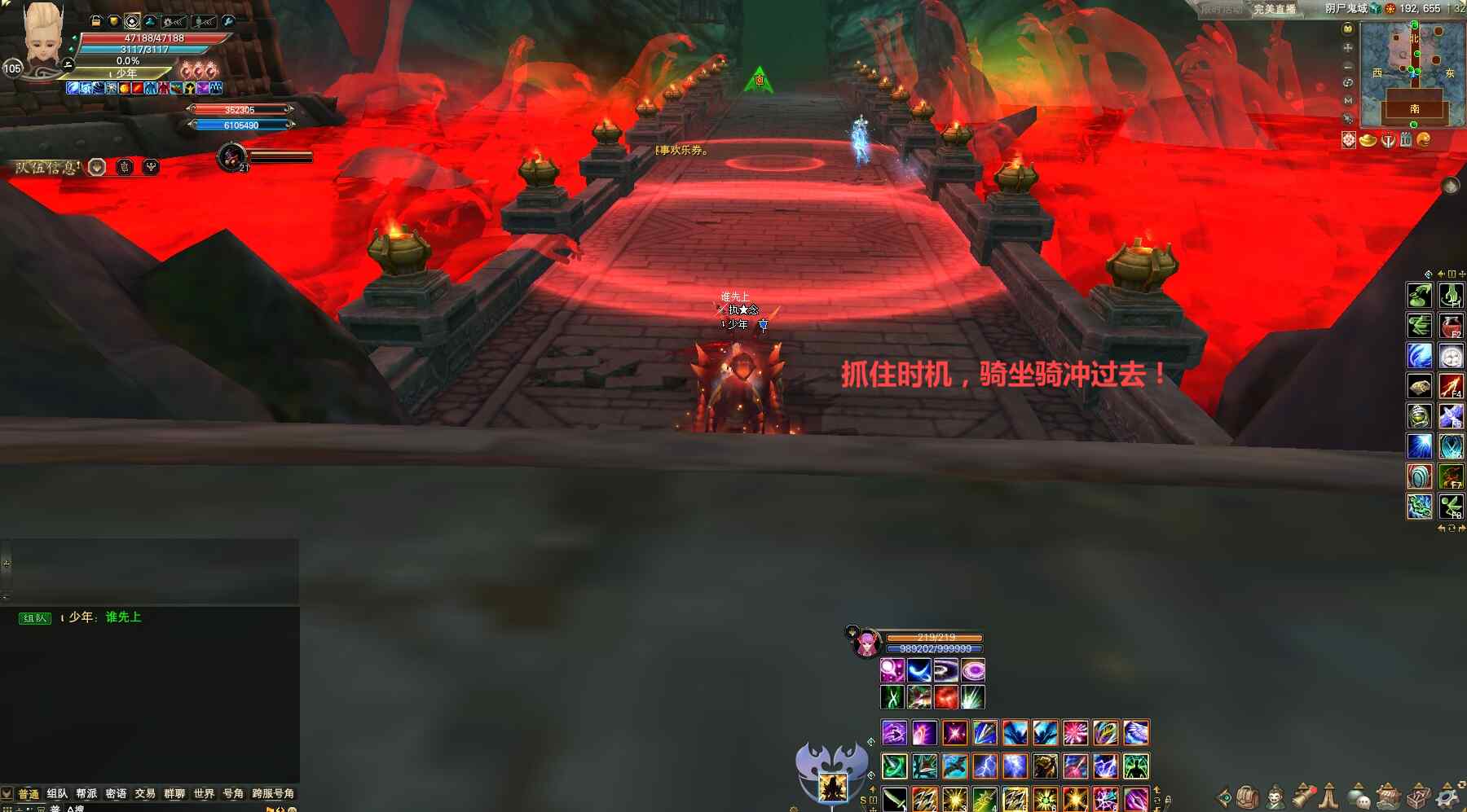 玩家上坐骑后,趁红圈扩散间隙快速通过,建议12米坐骑,挂掉直接回城再跑。