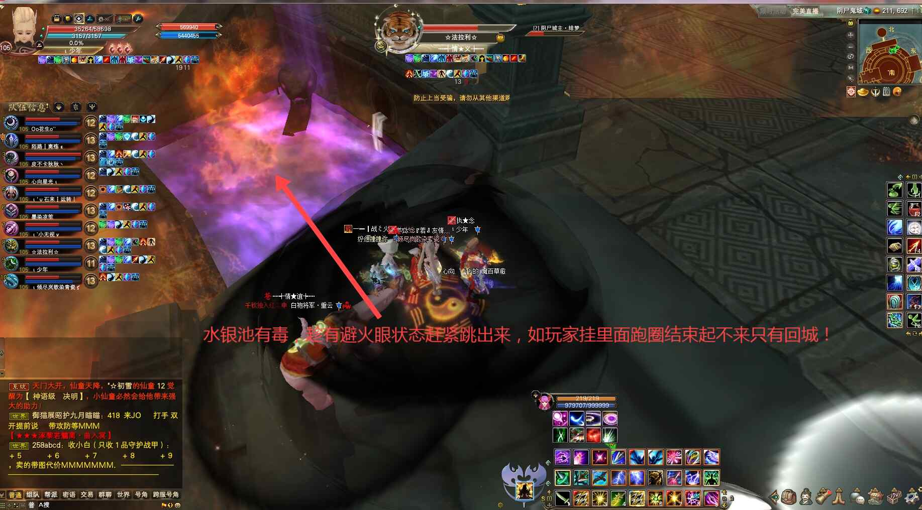 避火阵眼集合后,按左青龙、右白虎规则随机方向移动如下图所示,黑白圈移动前进可按转角集中一侧等避火阵眼、黑白罩子踩加速、靠前一个颜色直接从下方跟随避火阵眼进对应颜色罩子+靠后一个颜色从上面进对应颜色罩子,当避火阵眼到阴尸鬼蜮入口后直接去BOSS脚下集合继续战斗。避火阵眼移动中,水银池的图腾蛇会攻击其前方的玩家造成固定的高额伤害,羽灵注意群加血,且水银池剧毒,如有玩家掉水银池趁有避火阵眼状态赶紧跳出来,否则移动避火阵眼机制结束有玩家死水银池里起不来只有回城。