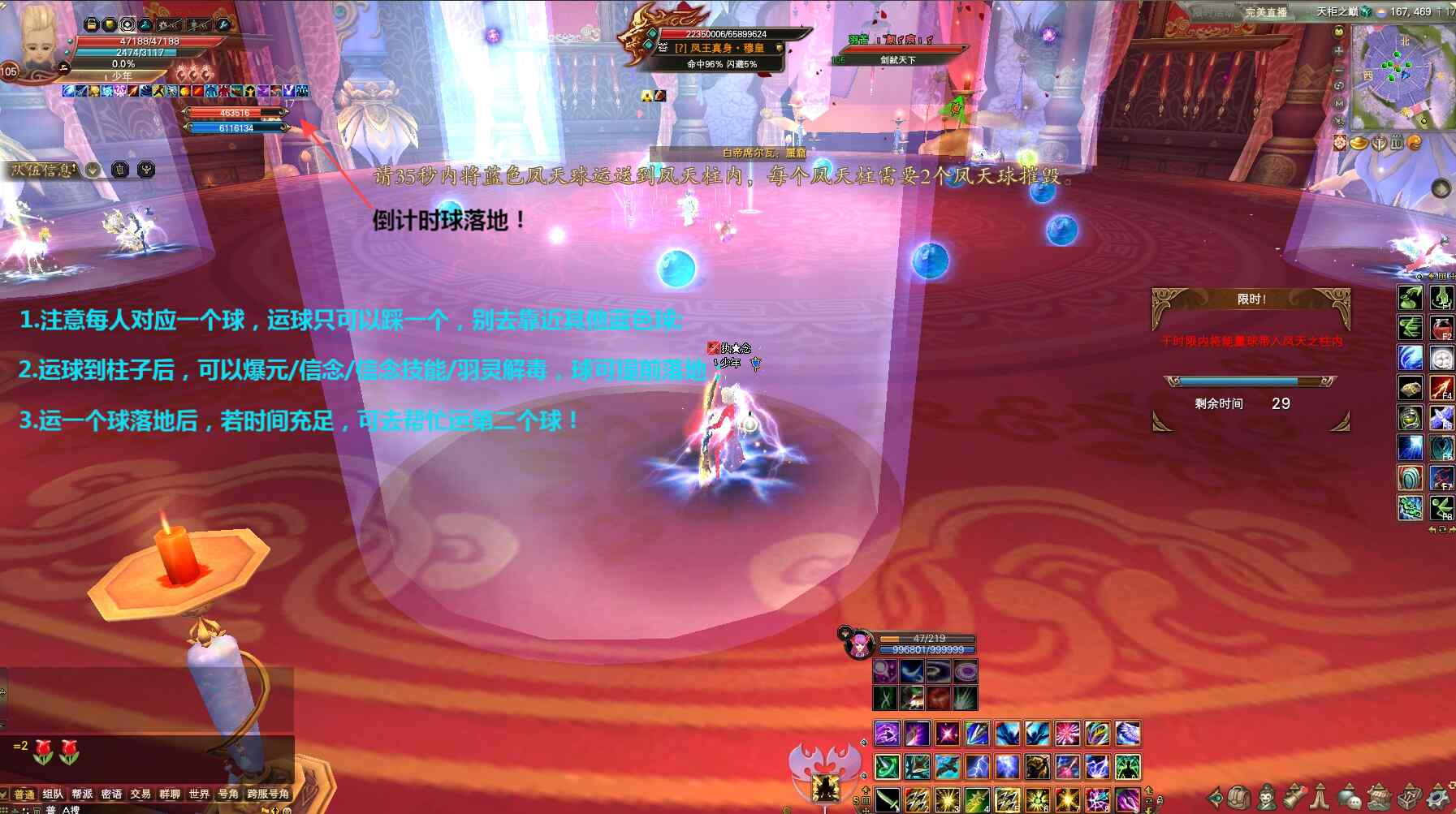 ⑴凤王真身.穆皇半血后两次出现10个蓝球,需玩家靠近蓝球获得倒计时雷电状BUFF如下图,按屏幕提示的规则正确算数站柱子等球自动掉落/用技能(如爆元/信念/信念技能/羽灵解毒等)提前掉落变绿球;