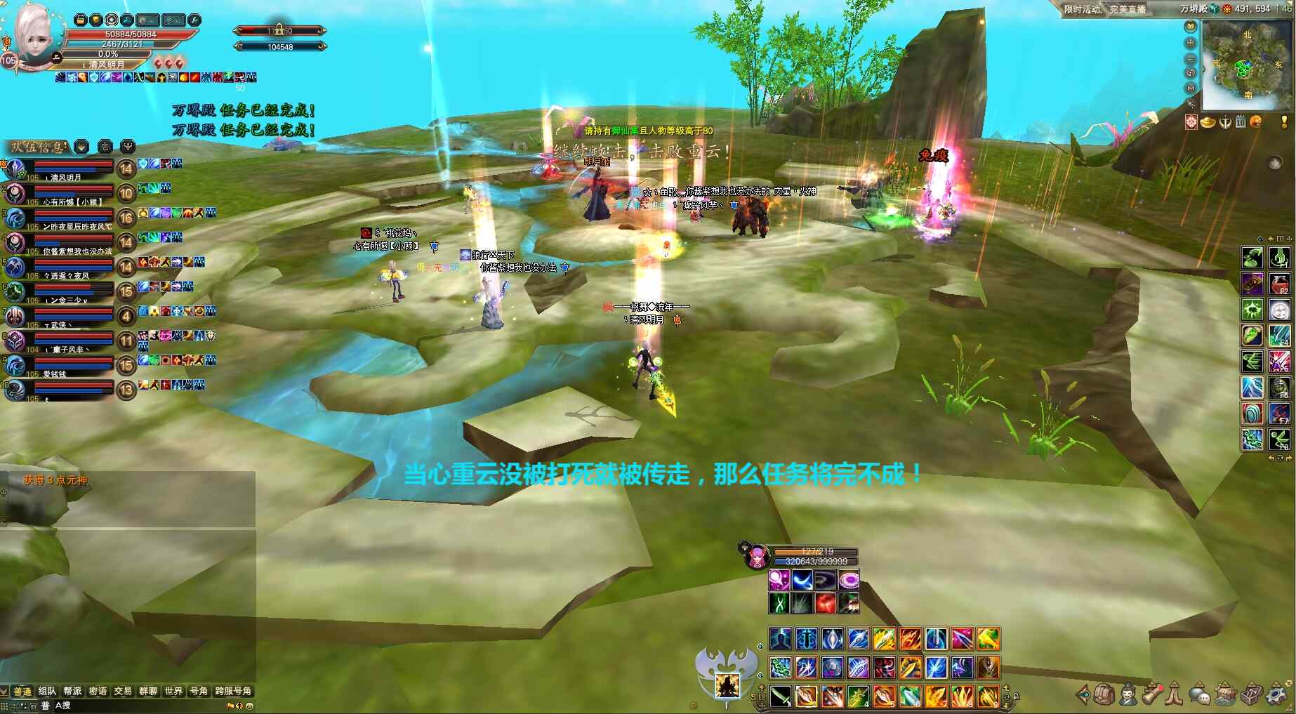 重云蹦出来时,震荡机制对全场玩家固定50%伤害、且脆皮玩家直接秒杀/可吃无敌抵挡,明月姬打下去时月仙直接对明月姬提前丢创世可降低重云的防御和延缓重云的吟唱,正常打手提前爆元集火重云,武侠丢龙妖精残体精灵泥泞等负面一起上,重云找谁追踪谁请别跑原地吃无敌抗/重云长枪频率刺杀注意走位躲避/近战当心重云回旋斩高额伤害,重云若出现减伤回血BUFF请妖精/妖兽第一时间驱逐掉,或魅灵拉线阻止重云回血,直到把重云打趴下,最后继续攻击打掉重云提示完成任务。