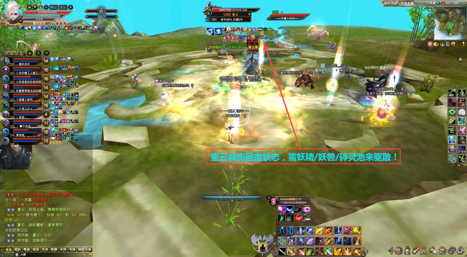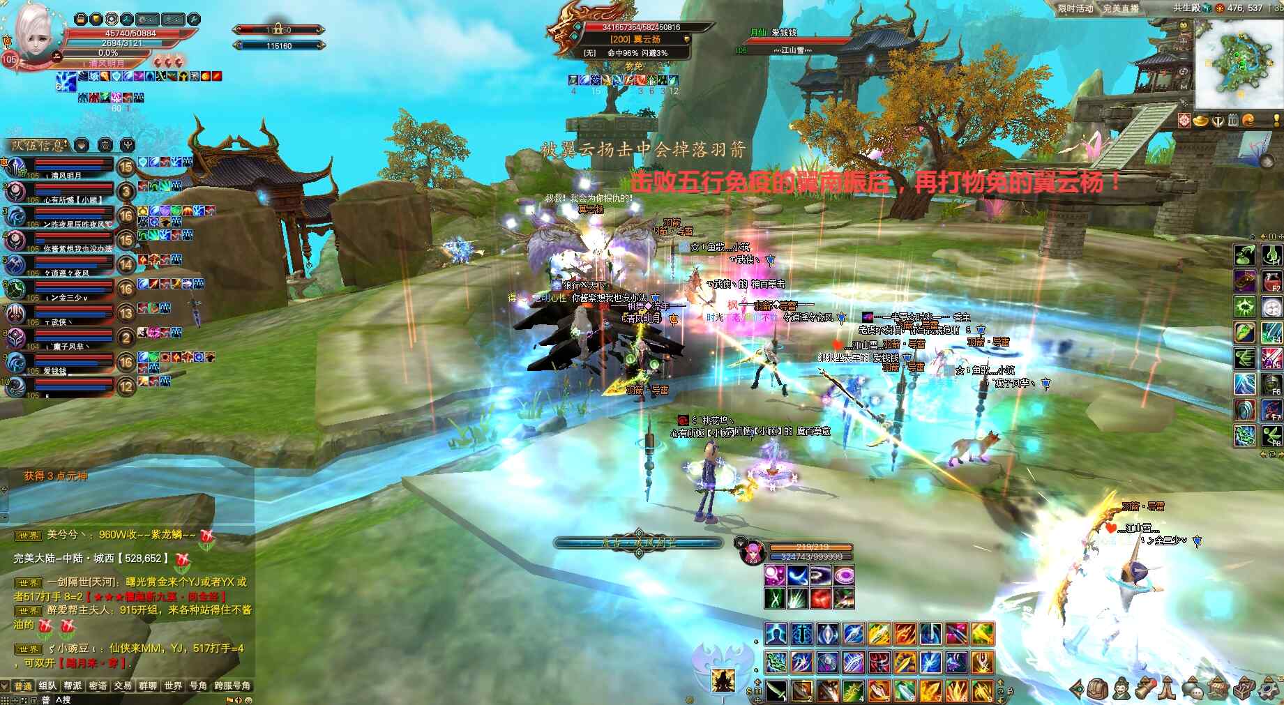 最后剩下物免的翼云杨,剑灵上剑印破釜靠法系打手输出伤害,战斗中当心翼云杨对空中射箭红字提醒,要么吃无敌、要么开免死技能、要么开闪避技能、要么开信念等,直到打掉翼云杨。