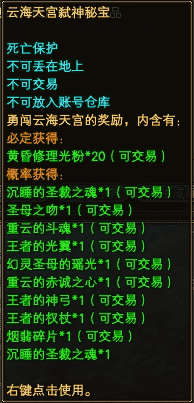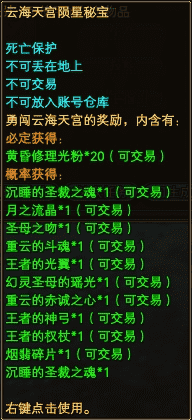 五、最后,挑战魔沁.明月姬成功将获得云海天宫陨星秘宝、挑战魔沁.明月姬失败将获得云海天宫弑神秘宝,分别如下图,可开出随机颜色1品月之流晶、17品装备生产材料、17品装备维修的黄昏修理光粉、沉睡的圣裁之魂绑定/可交易等。若当队长10次成功挑战黄昏圣殿·重启之云海天宫,可获得黄昏圣殿·重启之云海天宫银牌队长称号、附物理/法术攻击+10。