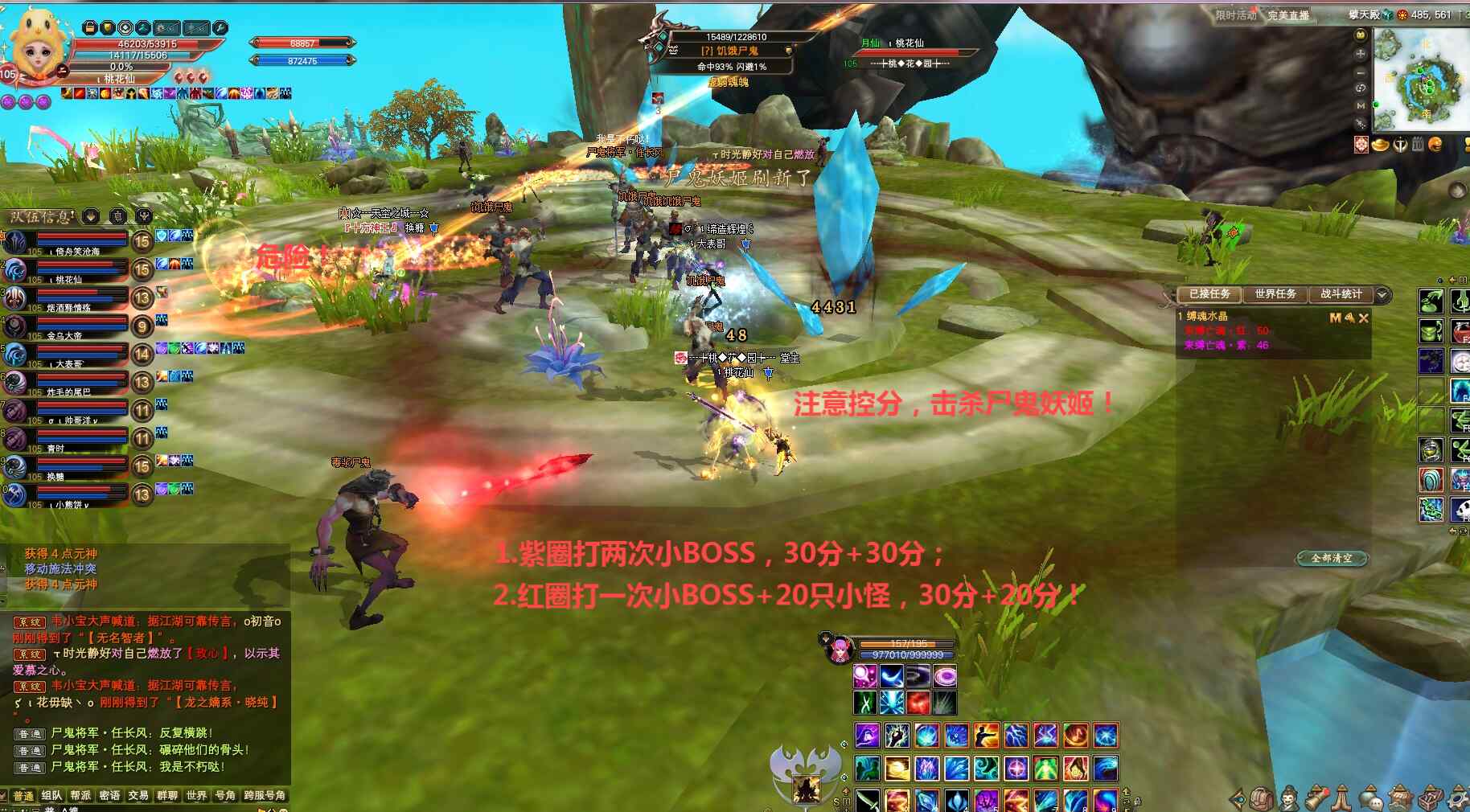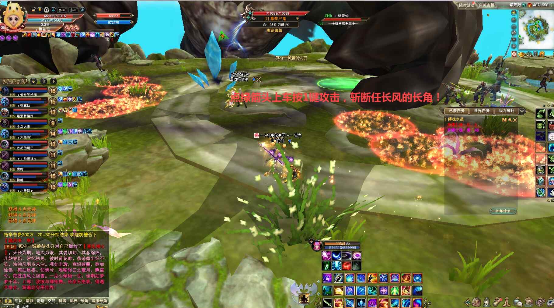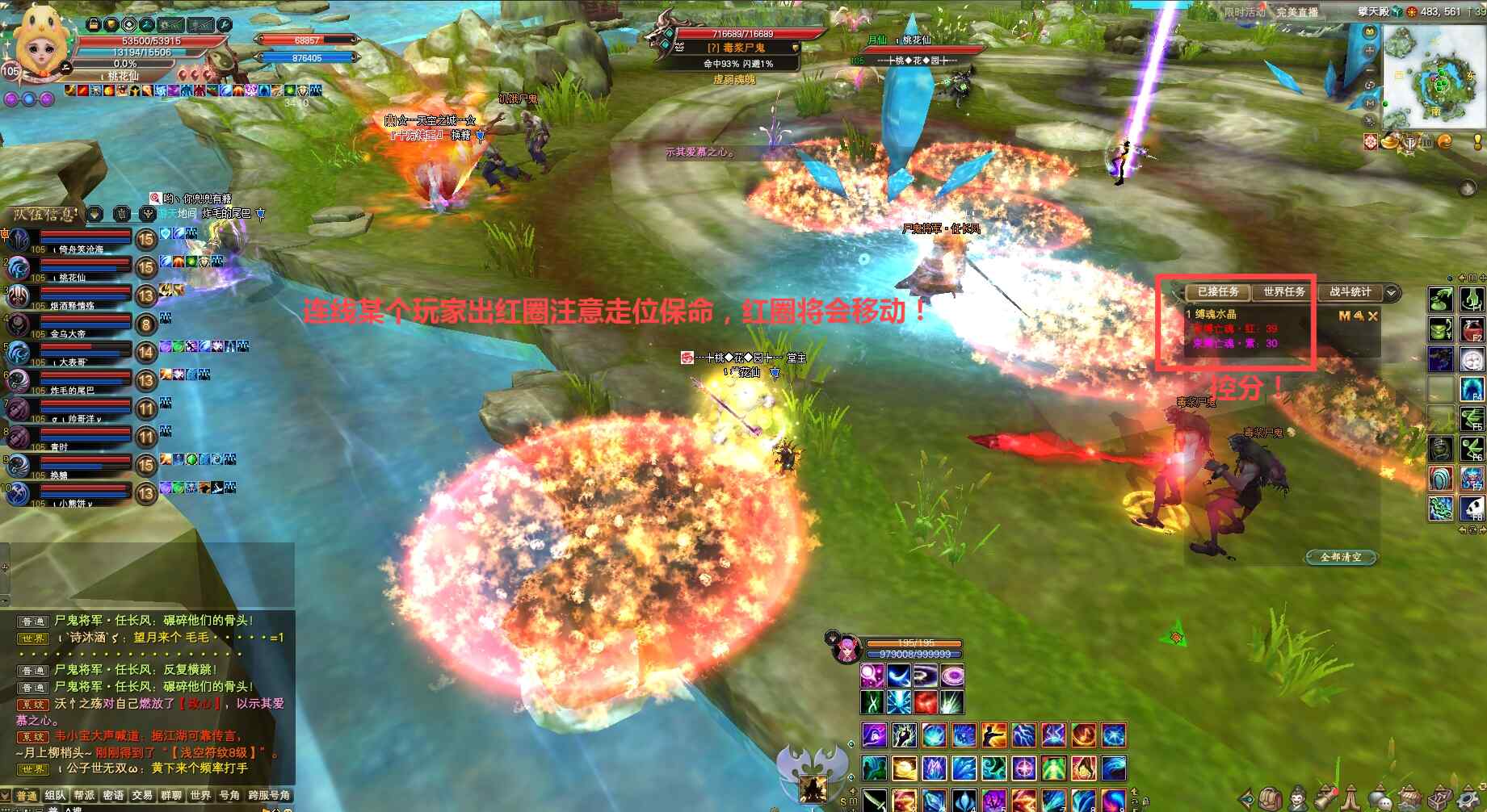 尸鬼将军开怪,任长风现身双免状态可提前上剑印,需充能红、紫缚魂水晶50点(Q键有任务提示已获得分数!),注意控分:紫圈击杀尸鬼将军两次→30分+30分、红圈击杀尸鬼将军一次和20只小怪→30分+20分,待任长风击破缚魂水晶限20秒内同时斩断其两个长角后让其虚弱,限时集火双免消失的任长风打一波输出伤害、正常可一波打掉。若伤害不够任长风将再次双免,充能缚魂水晶+连线移动火圈+尸鬼妖姬+上车斩双角等机制将重复一遍,直到击杀任长风。