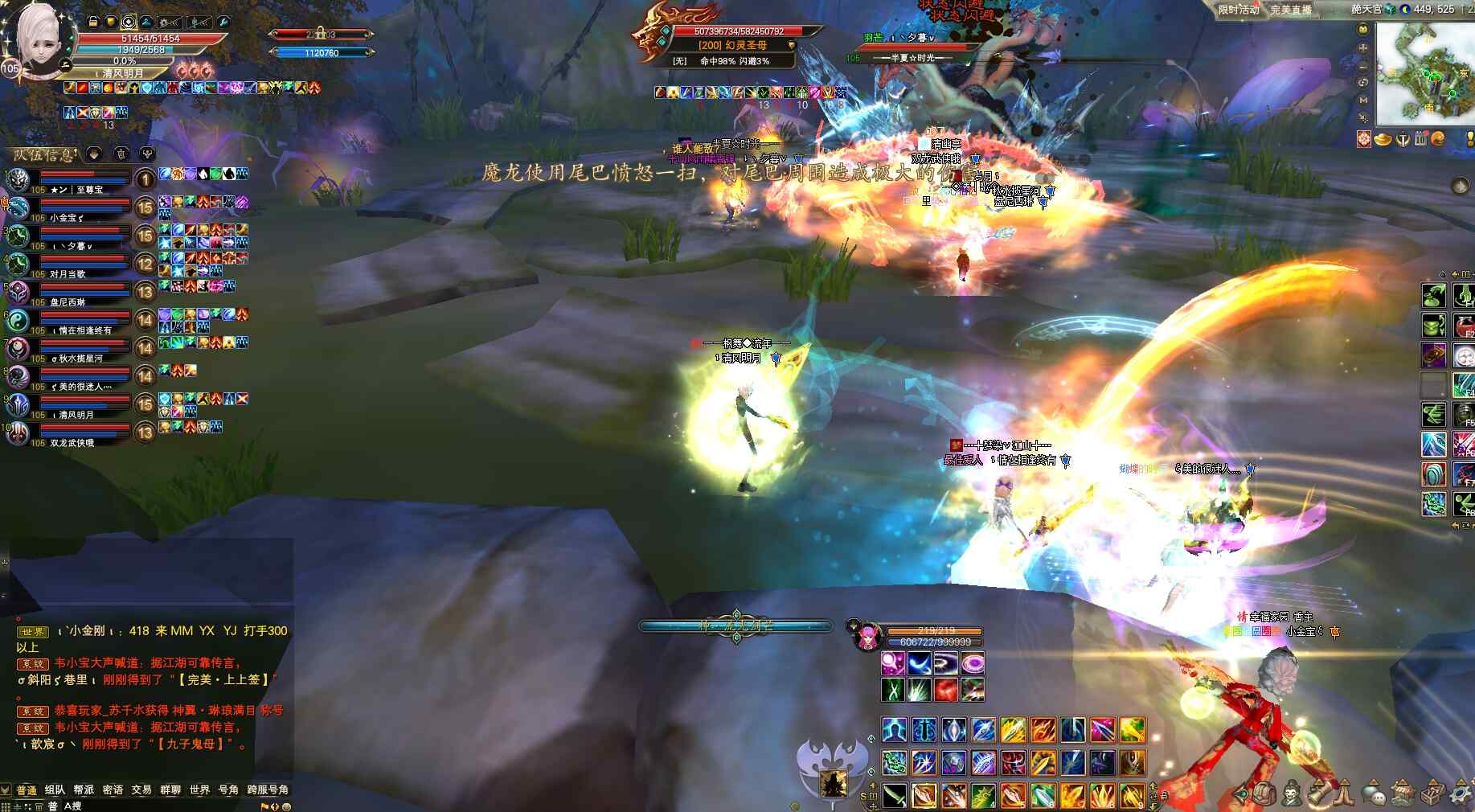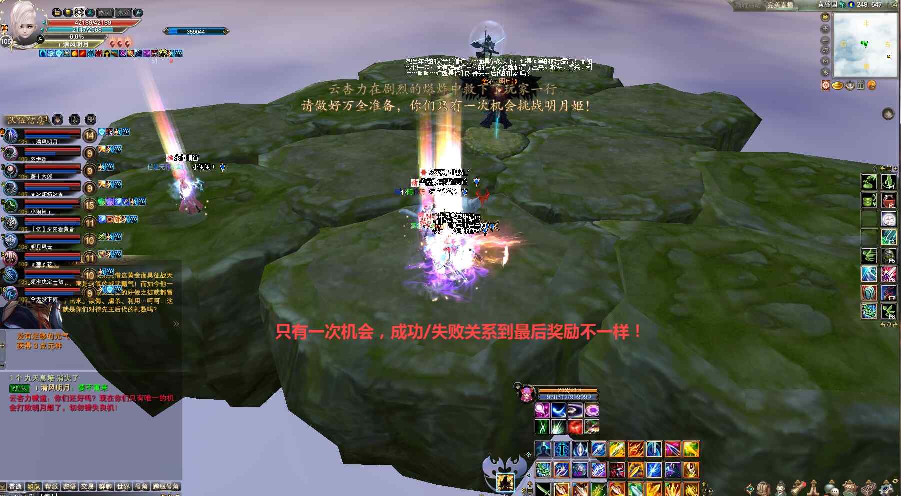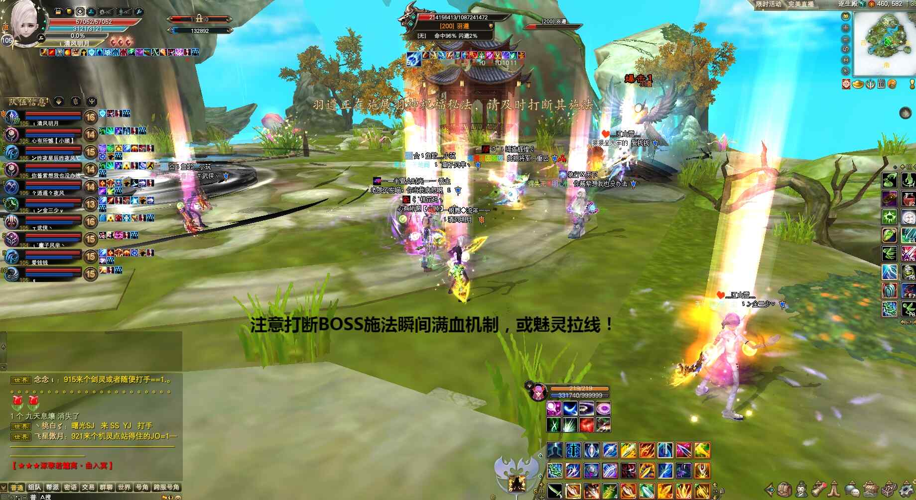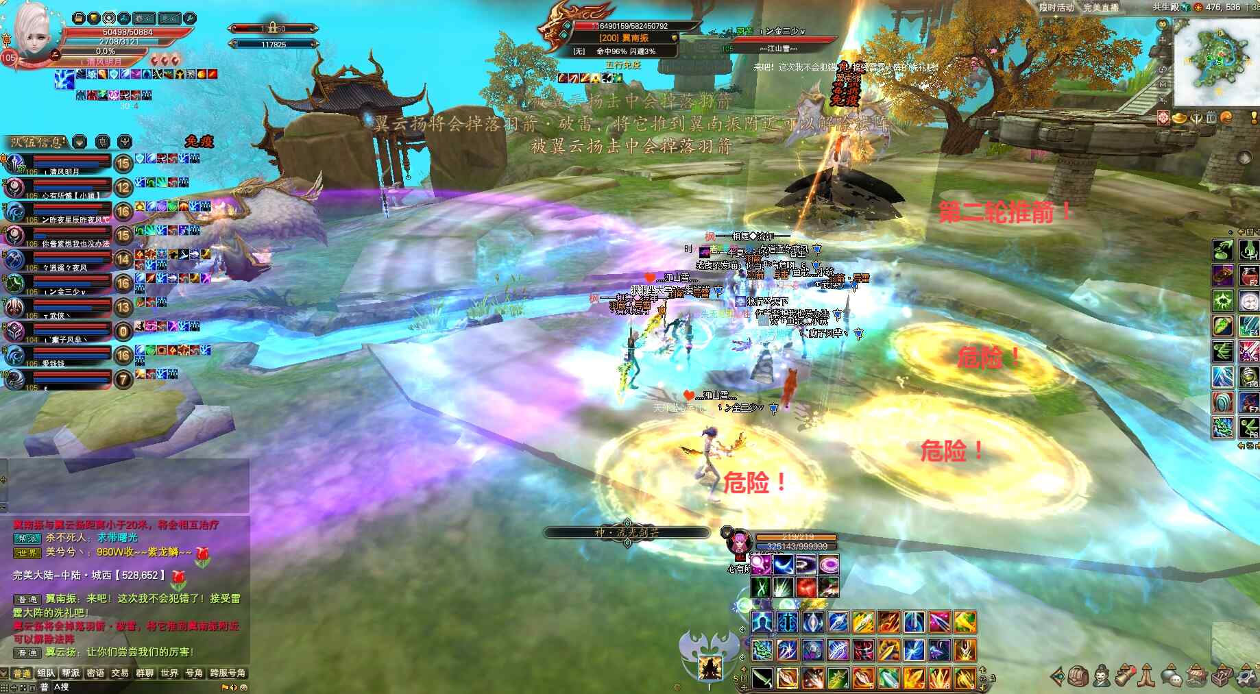 第二轮光柱法阵解除后,因翼南振是任务怪队长提醒大家注意保命,抗怪打手趁早打翼南振,翼南振双免消失同样第一仇恨将转移到开蓝阵羽灵,同样把翼云杨拉走避免BOSS无限回血,正常物理打手爆元集火翼南振上负面直接打掉。