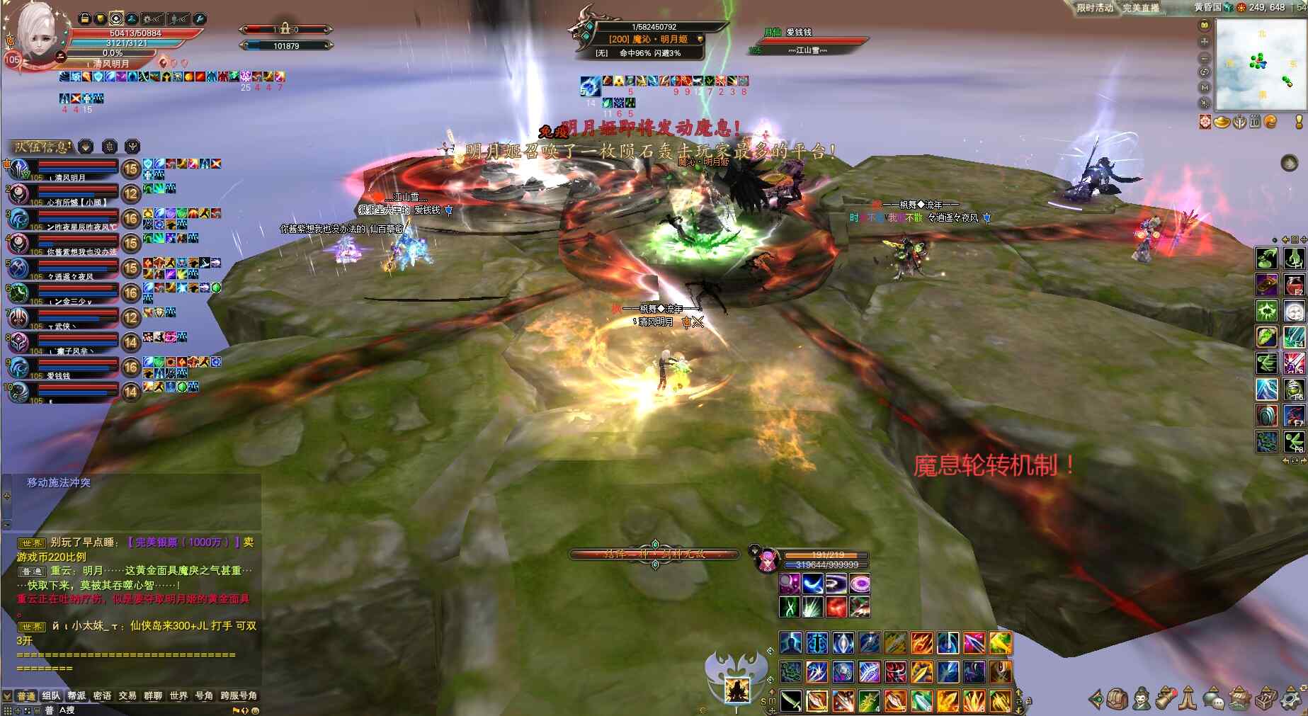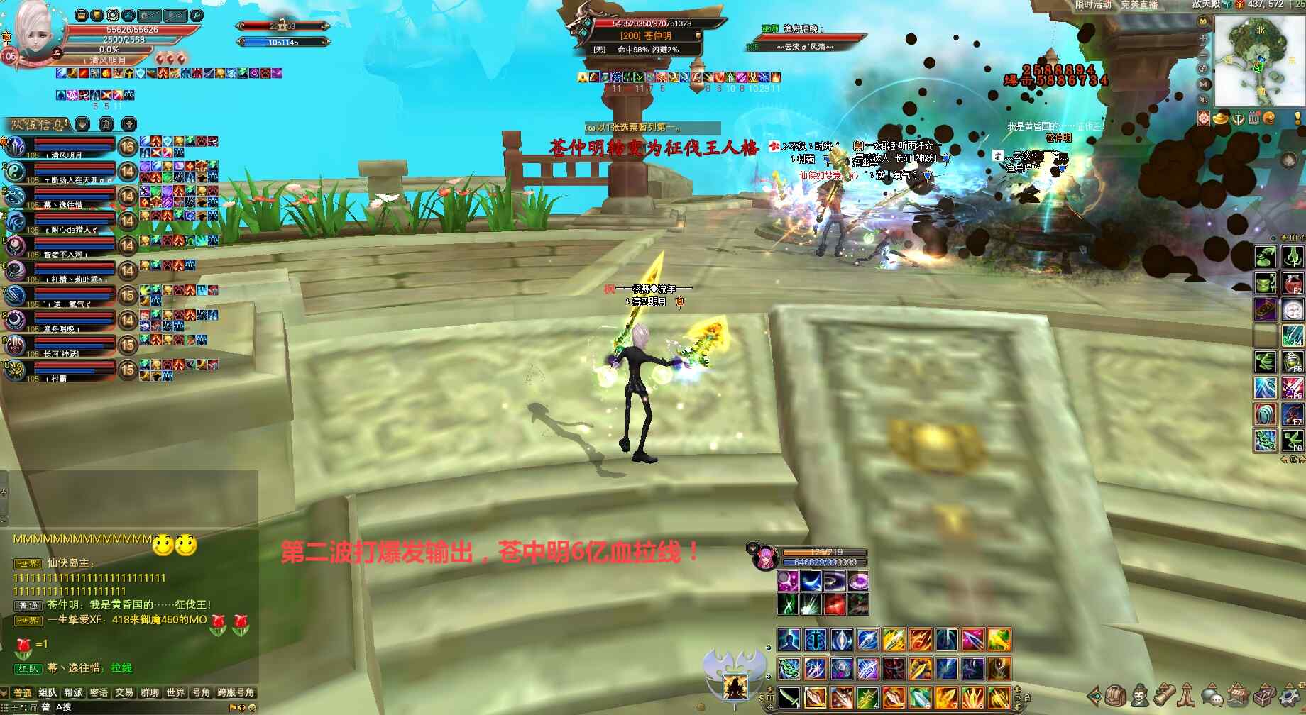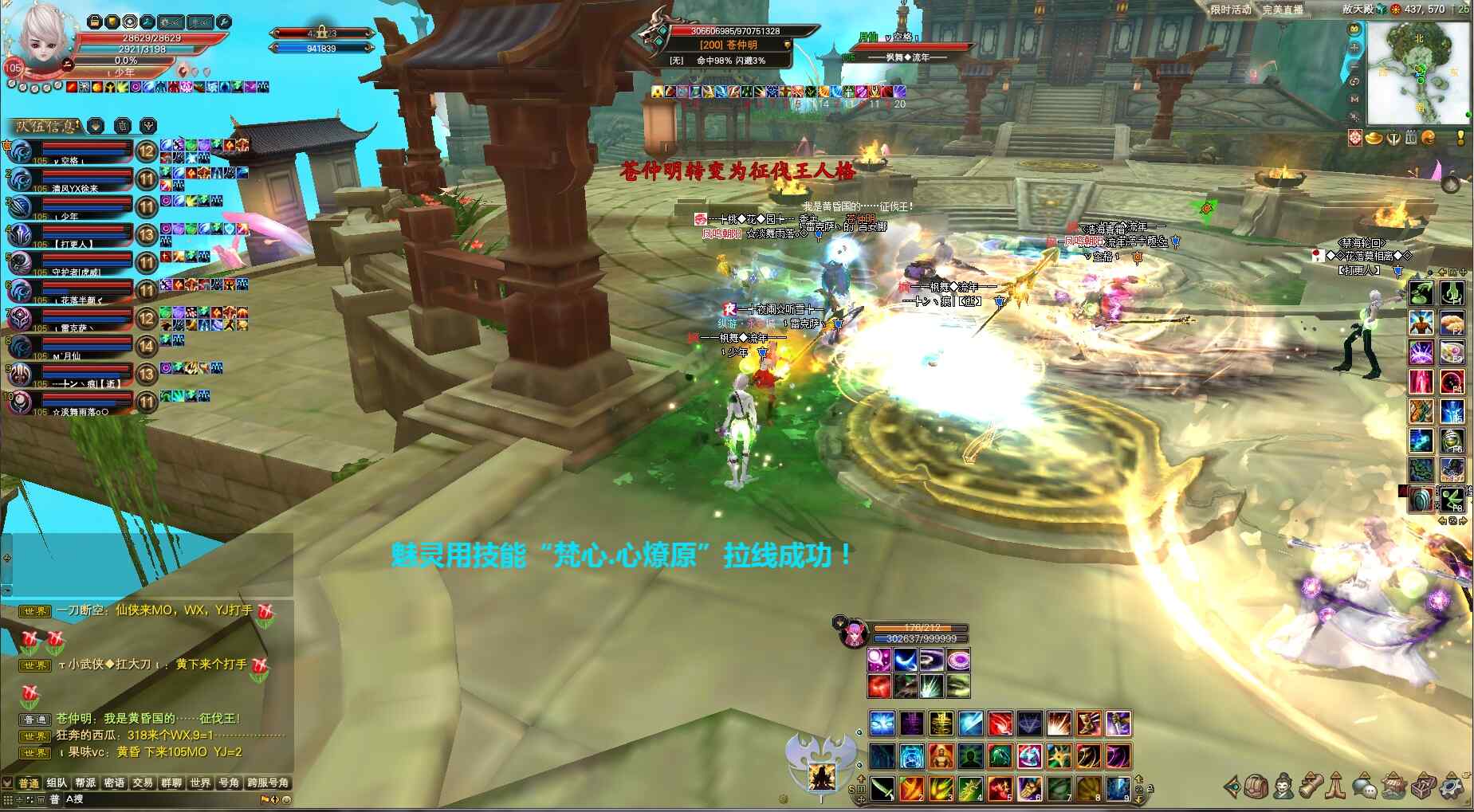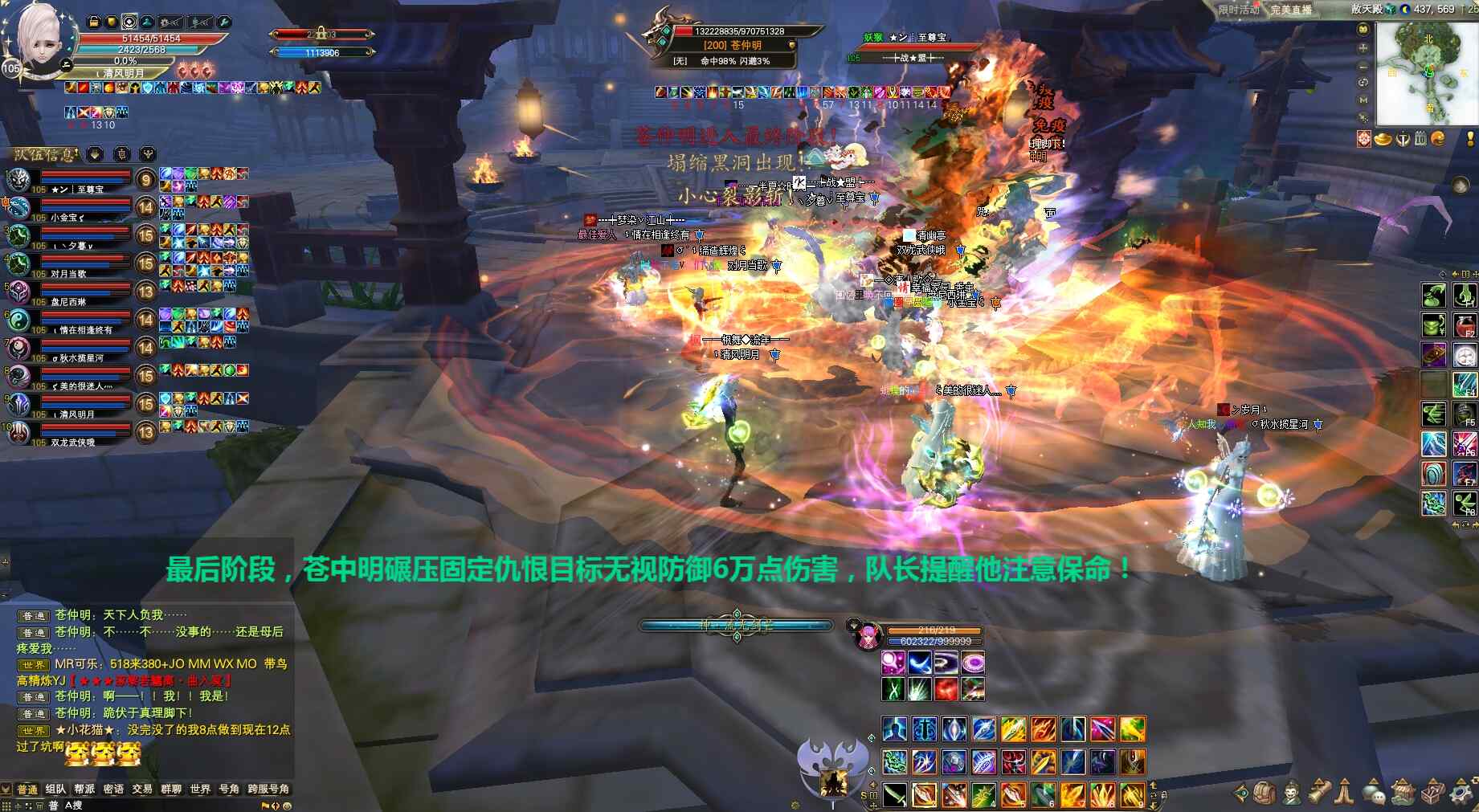 ②苍仲明第二种人格(第二阶段)打爆发伤害魅灵拉线玩法,要求队伍伤害足够限三秒内至少5亿伤害输出、且趁苍仲明7-8亿血魅灵瞅准时机拉线用技能“梵心.心燎原”阻止BOSS回血(同样魅灵拉线阶段月仙不可丢创世/妖精不可丢化石咒!),待拉线结束苍仲明直接进入最后阶段,队长提醒大家提前爆元一起集火BOSS,等吃伤害时剑灵剑印破釜武侠丢龙妖精残体等直接打掉,同样最后阶段抗怪职业注意吃无敌开免死抵挡苍仲明碾压高额伤害,最后阶段若队伍伤害高可不安排人拉黑洞双球。