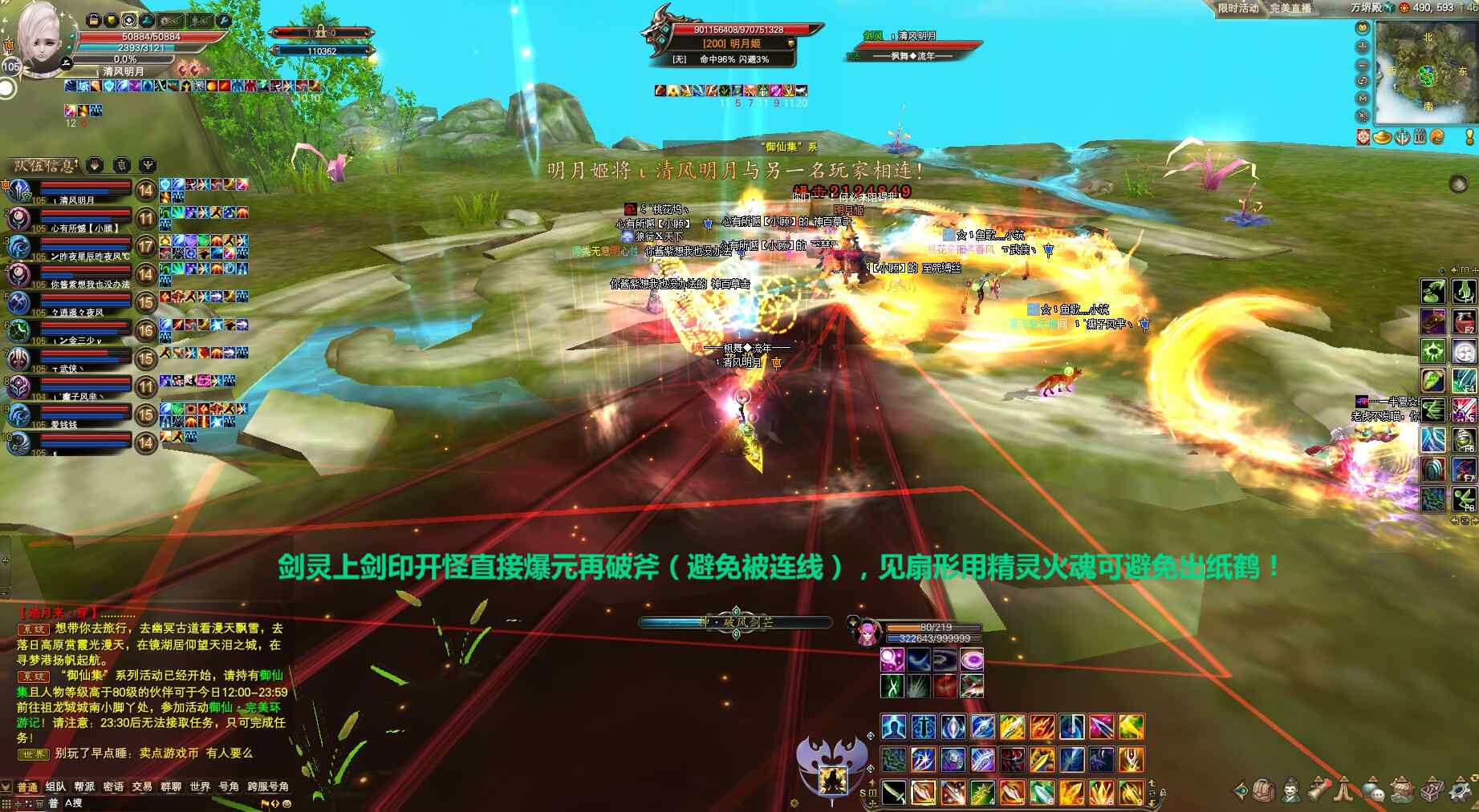 首先,队伍站位把明月姬围起来,剑灵上剑印开怪后直接爆元、再丢破釜(爆元可避免被第一个连线),明月姬随机扇形仇恨方向切忌左右跑直接开精灵火魂/吃无敌/爆元抵挡避免纸鹤出现,若有两名玩家被连线请相互远离直到连线消失,正常打手爆元集火明月姬,武侠丢龙妖精残体精灵泥泞等负面一起上,直接把明月姬打残血,这时候重云喊话将从屋内蹦出来。明月姬战斗中,当心场地已有纸鹤扇形若扫到将出凤凰全场致命打击团灭。
