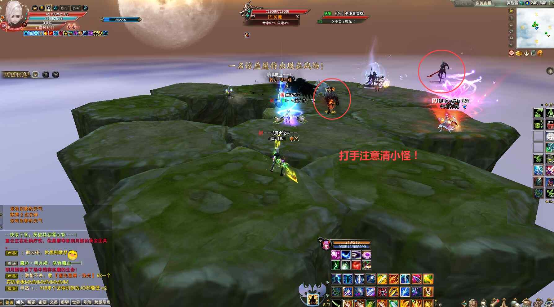 魔沁.明月姬指带上黄金面具的明月姬,注意只有一次挑战机会,成功/失败关系到最后奖励不一样。队长提醒大家别着急开怪,等技能冷却+无敌冷却+精灵冷却,匆忙开怪当心挑战失败。挑战魔沁.明月姬,关键机制就是躲避魔息转轮边走边打+躲避陨石火圈+第一时间击杀小怪/否则小怪被魔沁.明月姬吞噬后回血,以下按流程介绍。