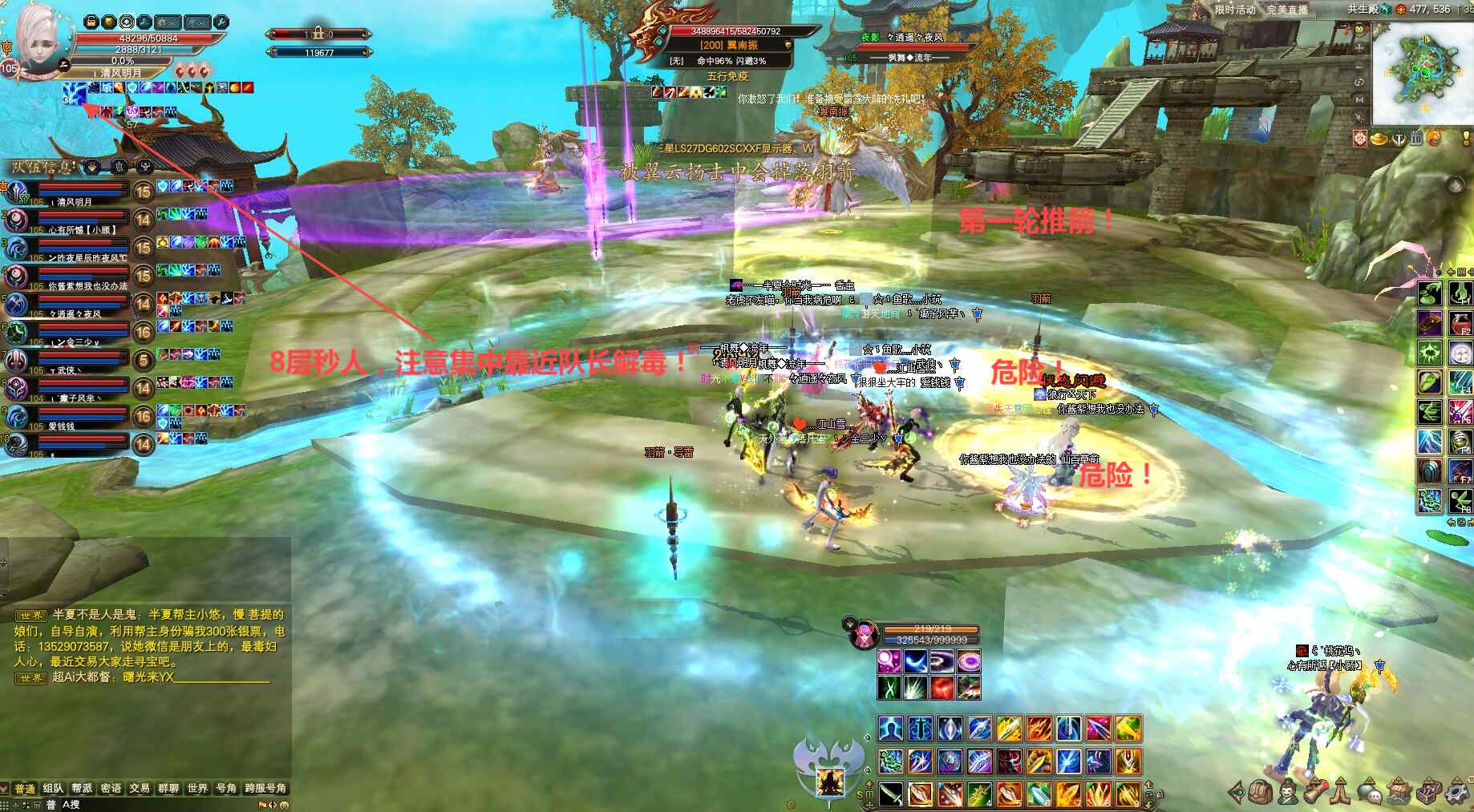 第一轮光柱法阵解除后,抗怪打手趁早打翼南振/翼南振双免消失第一仇恨将转移到开蓝阵羽灵,同样把翼云杨拉走避免BOSS无限回血,物理打手爆元集火翼南振上负面打一波输出将出现第二轮光柱法阵、抗怪打手注意保命当心翼南振碾压2万固定伤害,当光柱法阵出现拉翼云杨打手记得回来集中打一波羽箭解毒,待解毒后再去推三支羽箭.破雷到法阵中,战斗中当心黄圈长时间会快速叠加8层雷状态秒人及玩家8层雷状态直接被秒杀。
