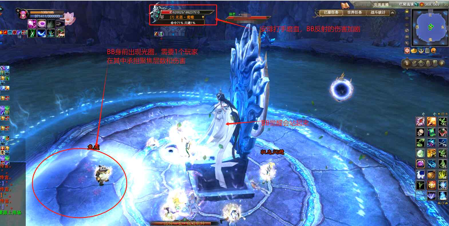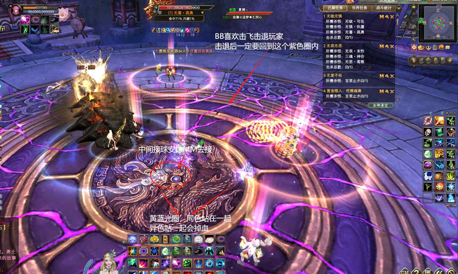 开怪后立刻爆元,时间卡的合适,可以免疫掉BB给的光圈,这里MM和MG可以开羽盾免疫光圈。光圈会持续90秒,90秒以后会刷新变化颜色。蓝色、黄色光圈,相同颜色站在一起,互相激励,可以提高玩家的战力增加输出。不同颜色的光圈站在一起,会互相伤害掉血,还会减速!出圈的时候,尽量不要点信念,容易出隐形圈。