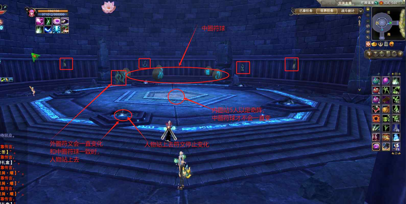 (注意:外圈5个人都站好后,尽量等中间内圈出1个“五灵顽石”,击杀“五灵顽石”后等2秒,再一起击杀外圈的5个符文,这样避免同时打5个符文的时候,出“五灵顽石”导致游戏失败。)