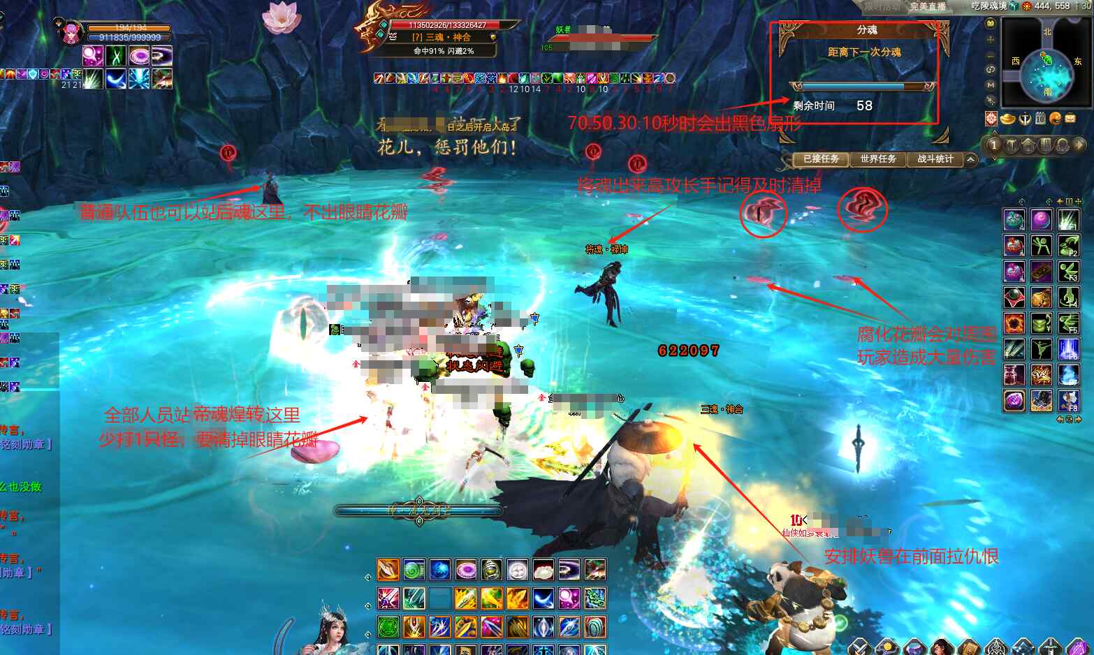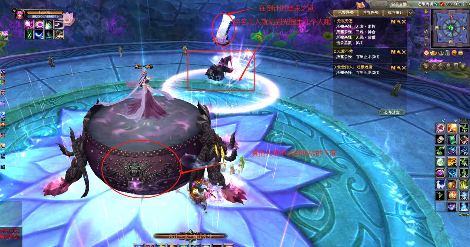 超过4个人以上玩家站在哪个小BB的净化光环里,就会净化这个小BB,就相当于策反了这个小BB帮我们!所以我们一般是10个人一起站在后魂·华仪身旁,羽灵尽量紧挨着后魂开蓝阵。这样的打法,就不会出现眼睛花瓣,只需要安排高攻打手,及时击杀出现的帝魂·煌转和将魂·禄坤即可。 也可选择站在帝魂·煌转身旁,这样就会出眼睛花瓣和将魂·禄坤,需要安排高攻打手及时清除! 具体站那个位置,可以按照队伍攻击来决定!个人比较建议正常队伍站后魂,高攻队伍站帝魂。