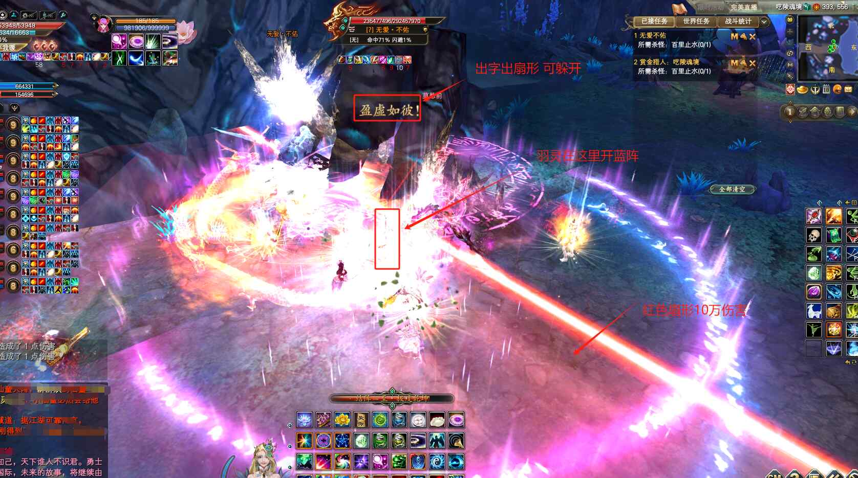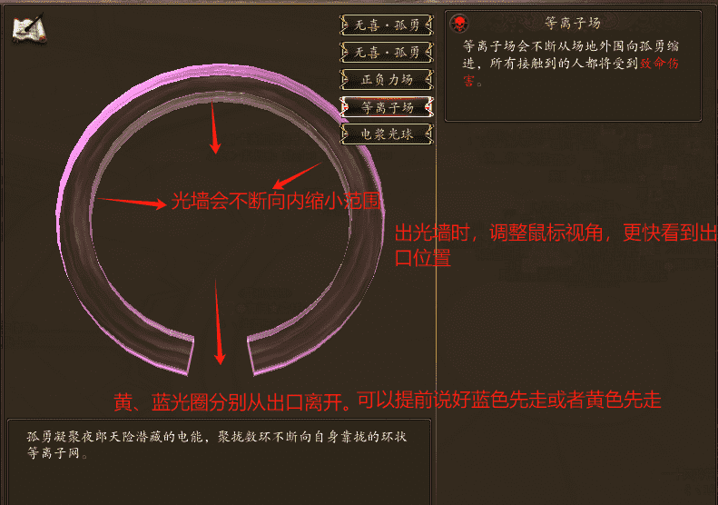 40秒以后,触发光墙机制,BB免疫伤害。一共出现5层光圈,光圈不断向内缩小范围,触碰到光墙壁的玩家,会被秒杀哦!玩家需要找到每层的出口离开,可以提前商量好那个颜色的圈先走,我们区一般是默认蓝圈先走!脚下蓝色光圈的玩家先通过出口离开,去下一层的出口,黄色光圈的玩家,在BB脚下先等一等,蓝圈走完了,黄圈在朝着出口走。脚下没有光圈的玩家就随意!这里可以开免疫技能哦,比如MM和MG的羽盾,武侠的至·金刚,刺客的三世等等,可以免疫光墙的秒杀效果,直接穿过5层光墙!