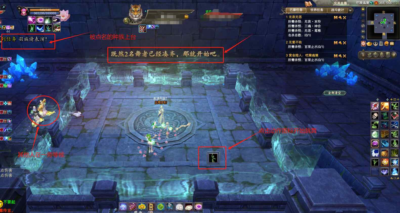 俗称“跳舞”,是比较耗费时间的一个小游戏。队伍10个人都达到台子上,才能触发任务开始。NPC会随机点名某个种族,上台表演,相对应职业玩家上台后,出现跳舞图标,点击开始跳舞,跳舞完成后8秒内下台,(不下台会被击杀)。一共需要成功完成5次演出,才能通过。上台人数不足,没有跳舞,队伍没有NPC点名的种族,种族职业错误,都会导致演出失败,全员被瘫痪,被打掉三分之二的血。这时候MM和MO要赶紧加血哦。只要大家都专心一些,不走神,这个小游戏还是能很快就通过的哦!需要注意的是,MM这里不能是紫夜舞变身状态哦,SS和YJ猴子 也不能是变身状态,要保持人形态,不然没办法跳舞!