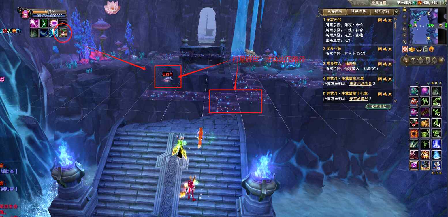 3次箭头冲锋之后,出8秒倒计时黯然魂殇,屏幕上有红色光圈不停闪烁,需要去钟乳石后面的绿色扇形里面躲避伤害。中间开阵的MM和没来得及躲避的玩家,可以在倒计时1秒的时候,用精灵技能“信念”哦!可以免疫所有不利状态!这里“绝对”是没有用的,一定要用信念!
