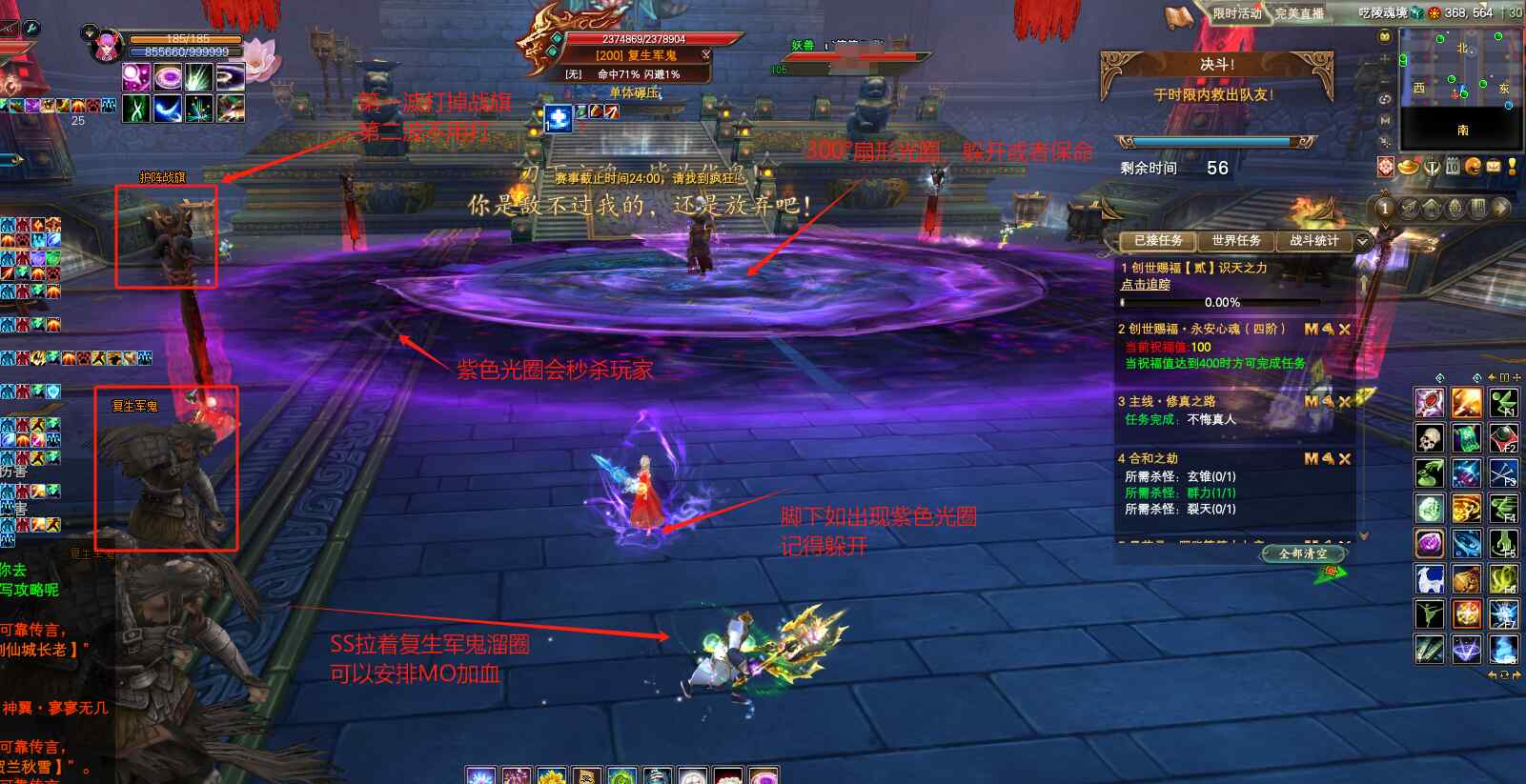 紫色大光圈内的玩家,需要躲避BOSS的300°紫色扇形和BB脚下的紫色圆形光圈。大光圈外的玩家,需要在60秒之内,击杀4个护阵战旗,救出光圈内的队友!