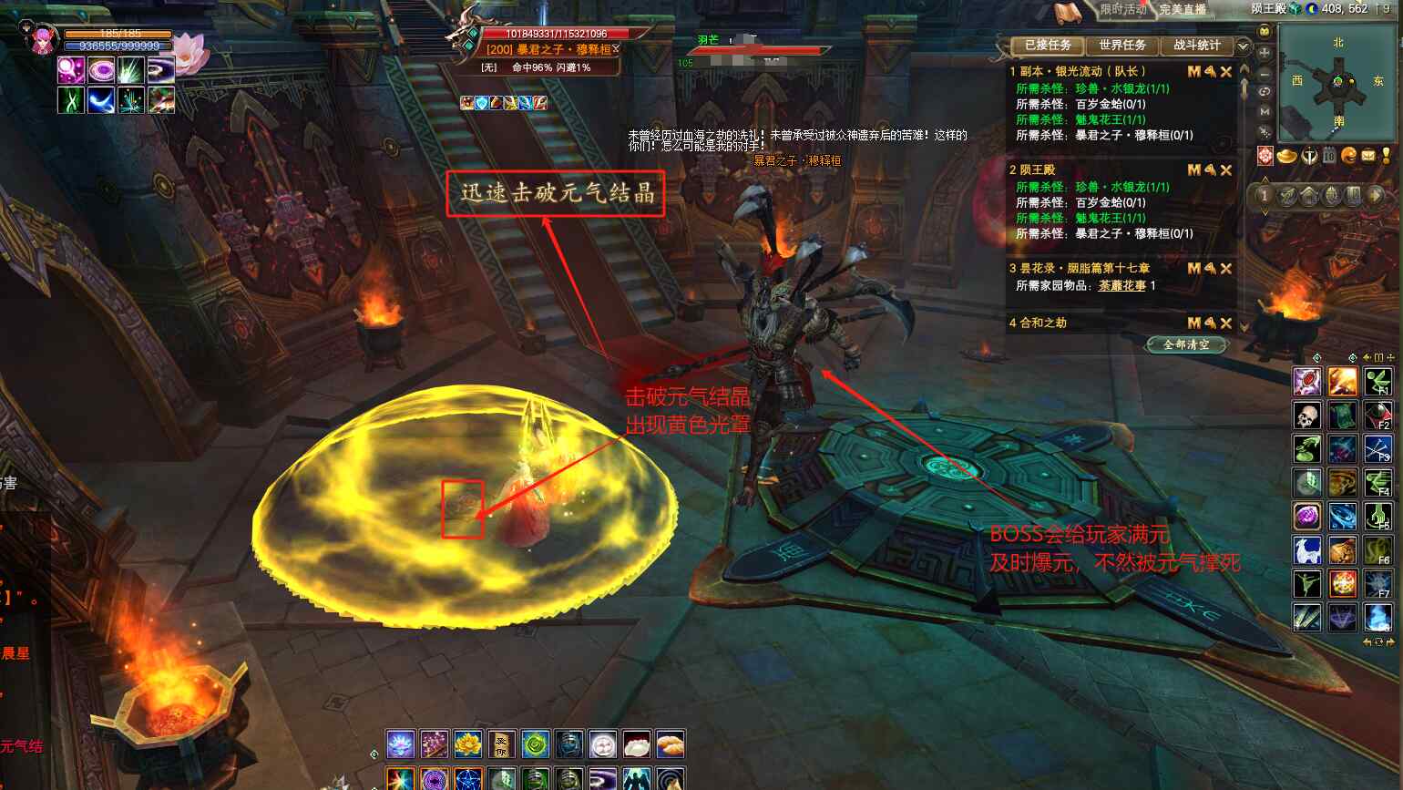 BOSS机制比较简单,屏幕出字“迅速击破元气结晶”,远程打手用“Tab键”快速切换目标选中元气结晶,击破元气结晶,出现黄色的光罩,所有玩家都需要进入光罩,免疫BOSS的秒杀技能。