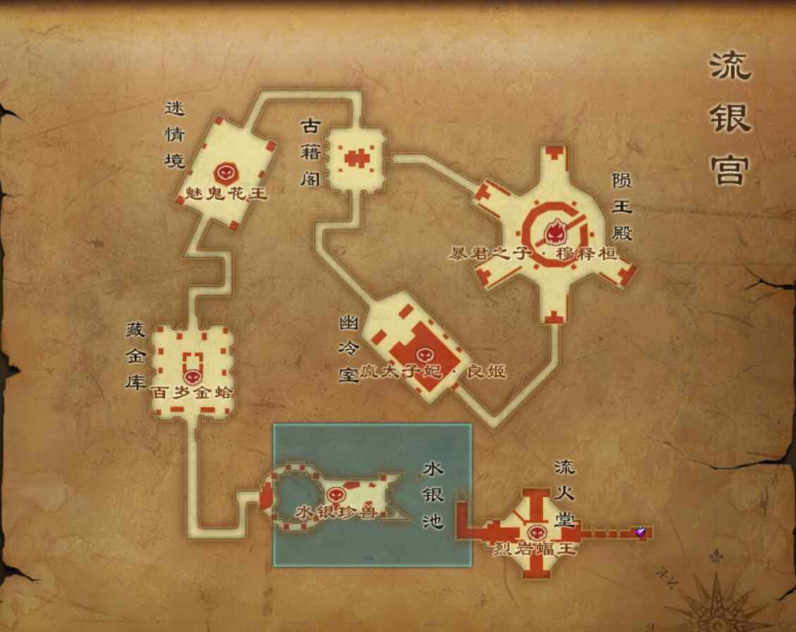 机关开启后,会出现BB“岩魔蝠王”,这个BB没啥机制,血量和攻击都不高,打手上去近身直接杀死就可以啦!脆皮小号不要去,BB会给玩家一个中毒加深伤害状态,小脆皮需要加血,不然容易挂!BB死了以后,身后的岩浆门打开,我们继续通往下一关水银池。(岩魔蝠王BB死亡后,流火堂的石头桥梁就不会消失了!所以可以先安排打手进来清掉BB,辅助和小号再进副本)