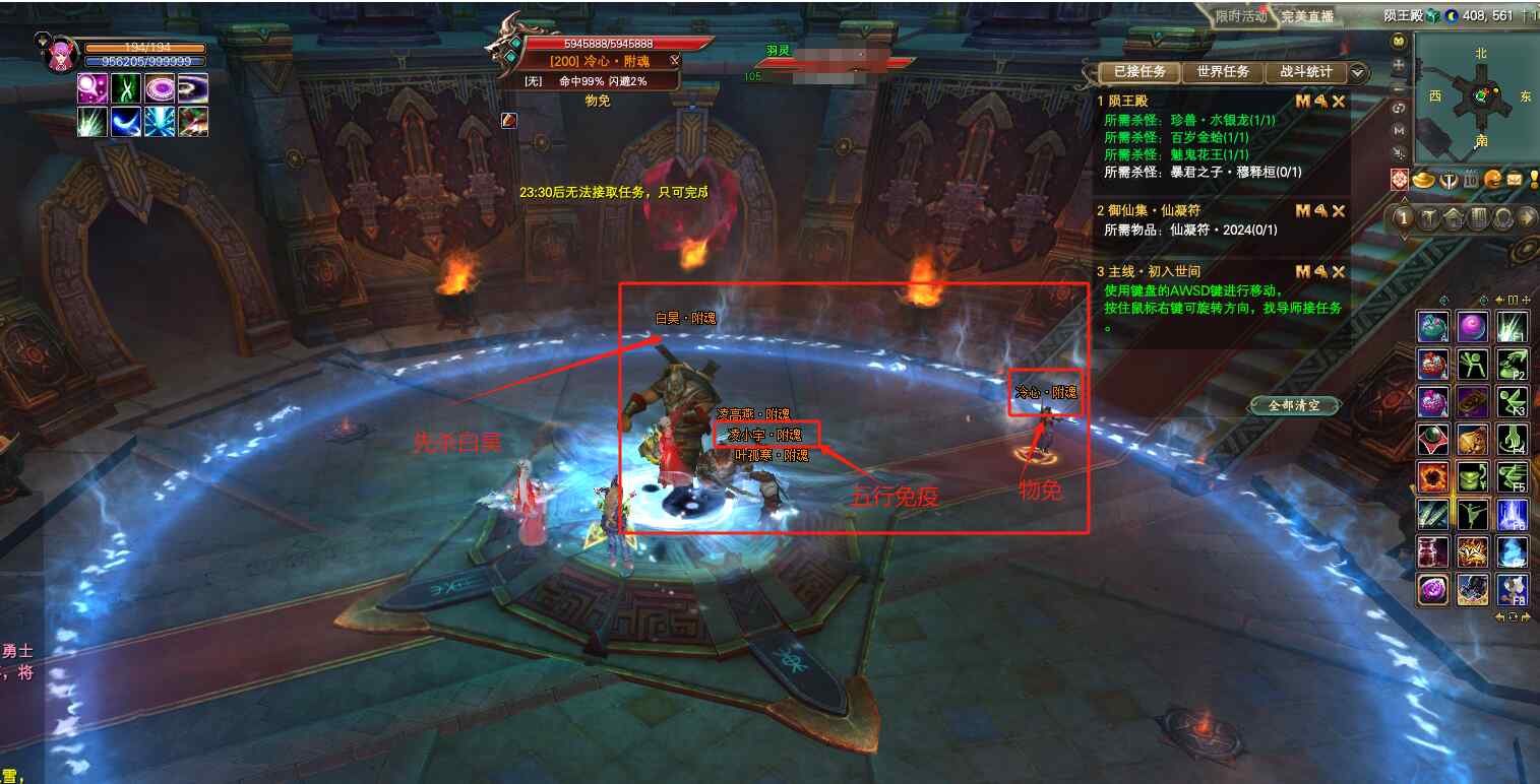 前往暴君之子·穆释恒所在的陨王殿,路上的通道和古籍阁里面,都会有小怪,建议打手在前面先清掉。脆皮和小号在上坐骑跑过去。清掉陨王殿的小怪后,会先出现五只小BOSS,分别是:白昊、凌高燕、凌小宇、叶孤寒、冷心。这里需要注意击杀顺序,会有概率出现小BB杀不死一直回血的情况哦!保险起见,FS和JO开阵群怪,MM开蓝阵,其他打手集火优先击杀白昊,再杀掉凌高燕、叶孤寒,最后在杀凌小宇和冷心。凌小宇是五行免疫状态,需要物理职业击杀,而冷心是物理免疫状态,需要法系职业击杀!