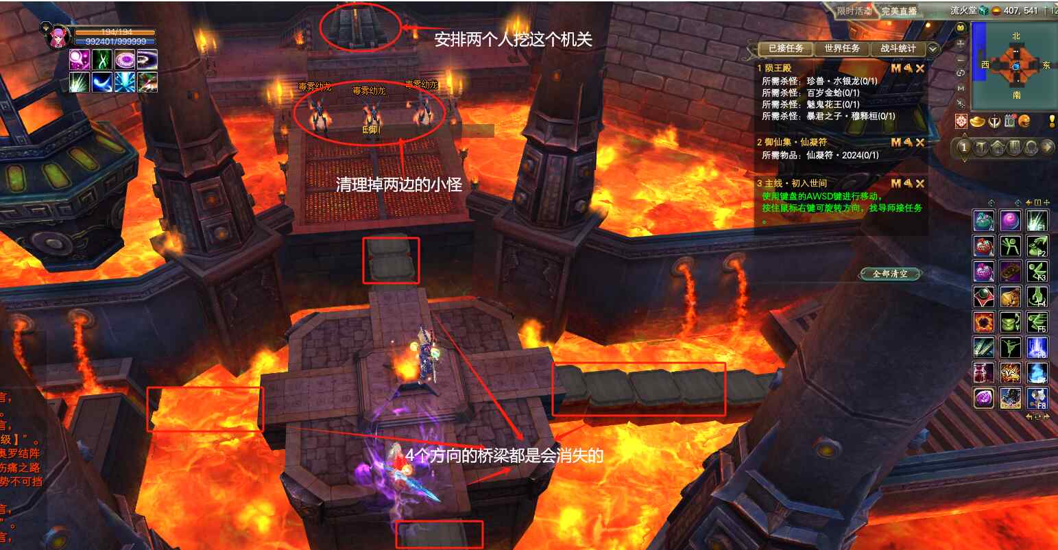 通过铡刀以后,是流火堂,前往台子中间的石头桥梁出现一会儿后就会消失,通过时注意看!第一次出现4个石头,这时候赶紧站上去最前面,5秒后出现剩余的3个石头,通过后就站到中间台子上了,台子上有8只幽蓝血蝠小怪,杀掉即可。